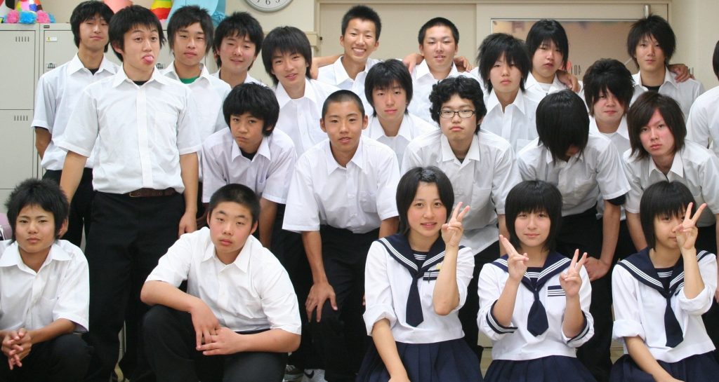 das escolas japonesas são: camisas brancas com colarinho alto, calças pretas ou
